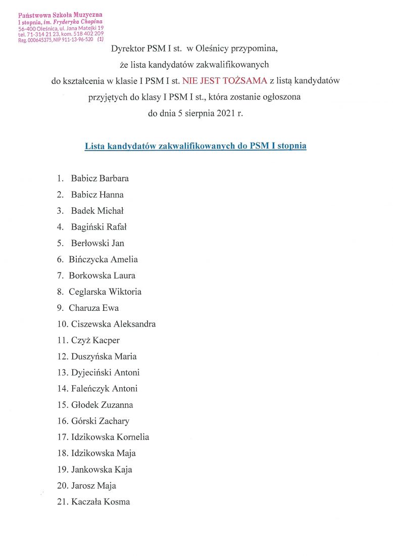 Dyrektor PSM I st. w Oleśnicy przypomina, że lista kandydatów zakwalifikowanych do kształcenia w klasie I PSM I st. NIE JEST TOŻSAMA z listą kandydatów przyjętych do klasy I PSM I st., która zostanie ogłoszona do dnia 5 sierpnia 2021 r.