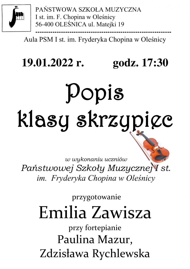 Popis uczniów klasy skrzypiecAktualności - OgłoszeniaPopis uczniów klasy skrzypiecZdjęcia z popisu uczniów klasy skrzypiec przygotowanego przez nauczyciela Panią Emilię Zawiszę zostały zamieszczone w zakładce - galeria- Zapraszamy do obejrzenia.