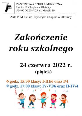 Zakończenie roku szkolnegoAktualności - OgłoszeniaZakończenie roku szkolnegoW uroczystości może uczestniczyć uczeń z jednym rodzicem/opiekunem.